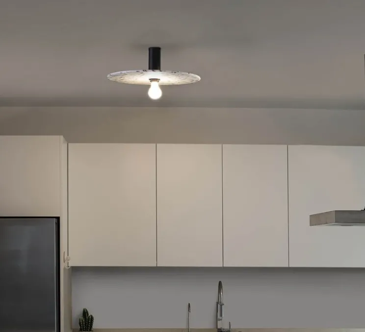Dotée d’un abat-jour en plastique recyclé aux motifs marbrés noirs et blancs, et d’une structure en aluminium noir mat, la Confetti 450 est un luminaire polyvalent. Elle peut être installée en applique murale mais également en plafonnier, s’intégrant harmonieusement dans divers espaces intérieurs.