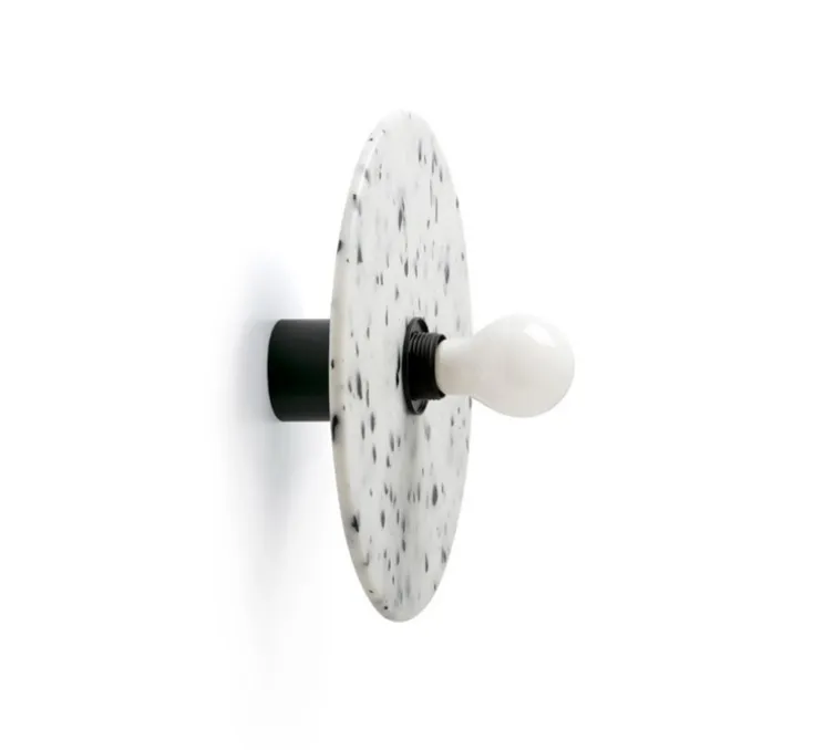 Dotée d’un abat-jour en plastique recyclé aux motifs marbrés noirs et blancs, et d’une structure en aluminium noir mat, la Confetti 450 est un luminaire polyvalent. Elle peut être installée en applique murale mais également en plafonnier, s’intégrant harmonieusement dans divers espaces intérieurs.