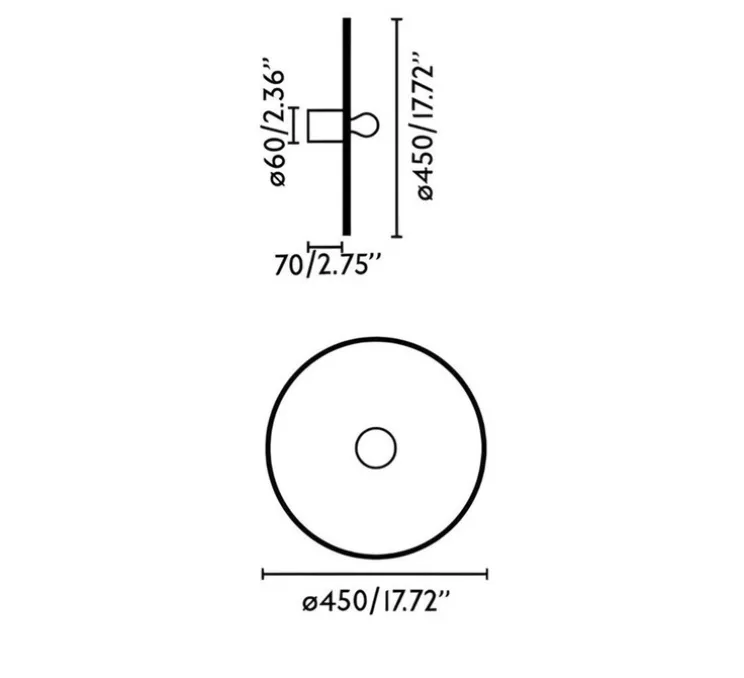 Ce luminaire mesure 45 cm de diamètre pour une profondeur de 7 cm, offrant une présence discrète mais notable. Il est compatible avec une ampoule E27 d’une puissance maximale de 15W (non incluse).