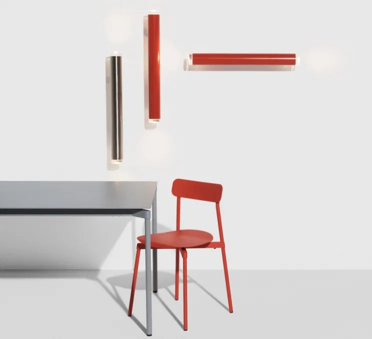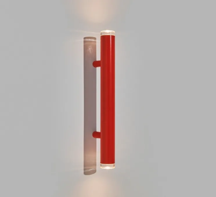 Fixée parallèlement au mur ou au plafond, cette applique/plafonnier cylindrique s’accompagne de deux disques en verre moulé qui diffusent la lumière aux extrémités. Sa forme graphique et sa finition en acier peint en rouge en font une pièce décorative architecturale, qui peut s’installer seule ou en composition linéaire pour souligner une circulation, une cimaise ou un pan de mur. Elle trouve également sa place dans les salles de bains ou extérieurs couverts grâce à son indice de protection IP44.