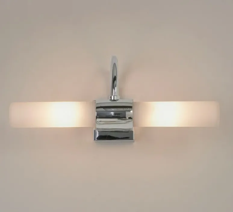 Dotée d’un bras en chrome poli et d’un double abat-jour cylindrique en verre opalin, elle adopte une ligne légèrement arquée, inspirée des appliques de salle de bains classiques mais revisités avec élégance contemporaine.