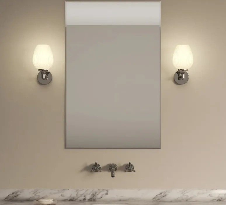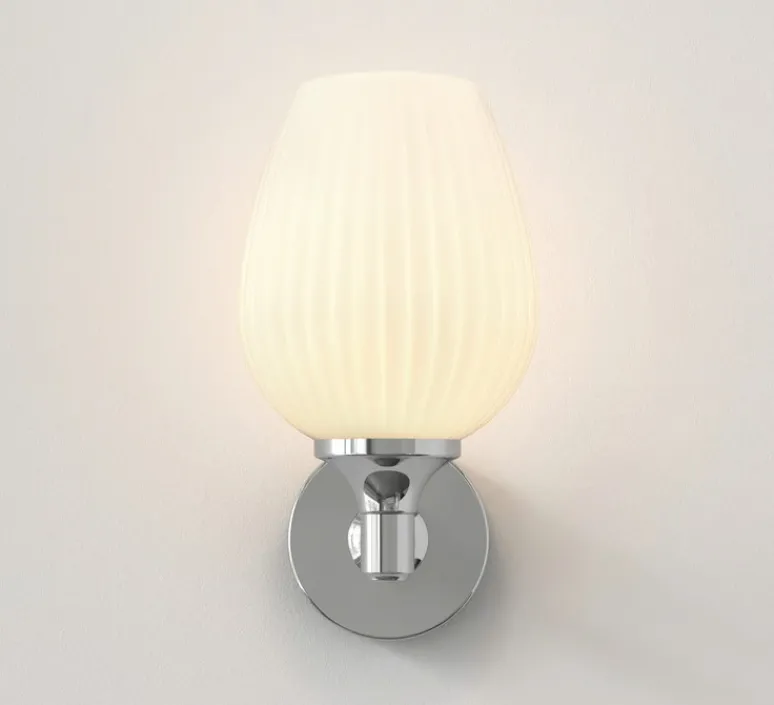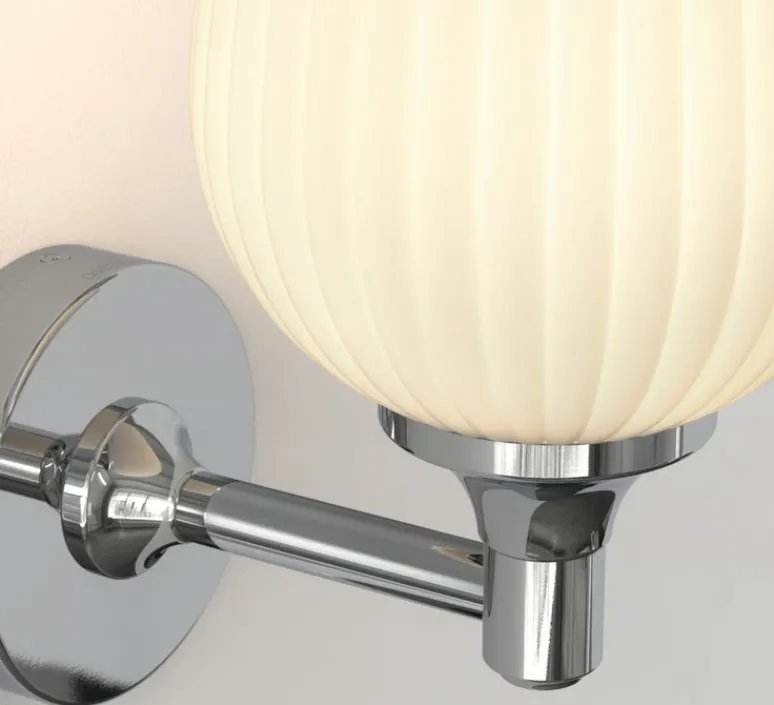 Ce modèle mural en métal chrome poli, doté d’un abat-jour en verre opalin, combine design décoratif et exigence technique pour répondre aux environnements humides.