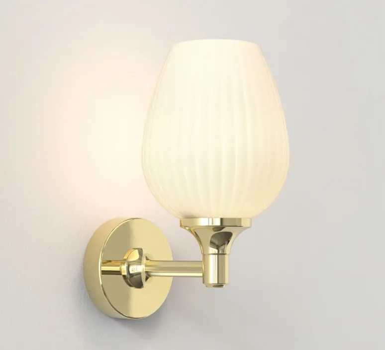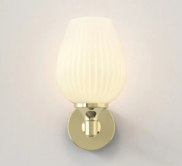 Ce modèle mural en métal laiton poli, doté d’un abat-jour en verre opalin, combine design décoratif et exigence technique pour répondre aux environnements humides.
