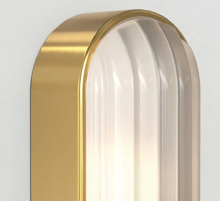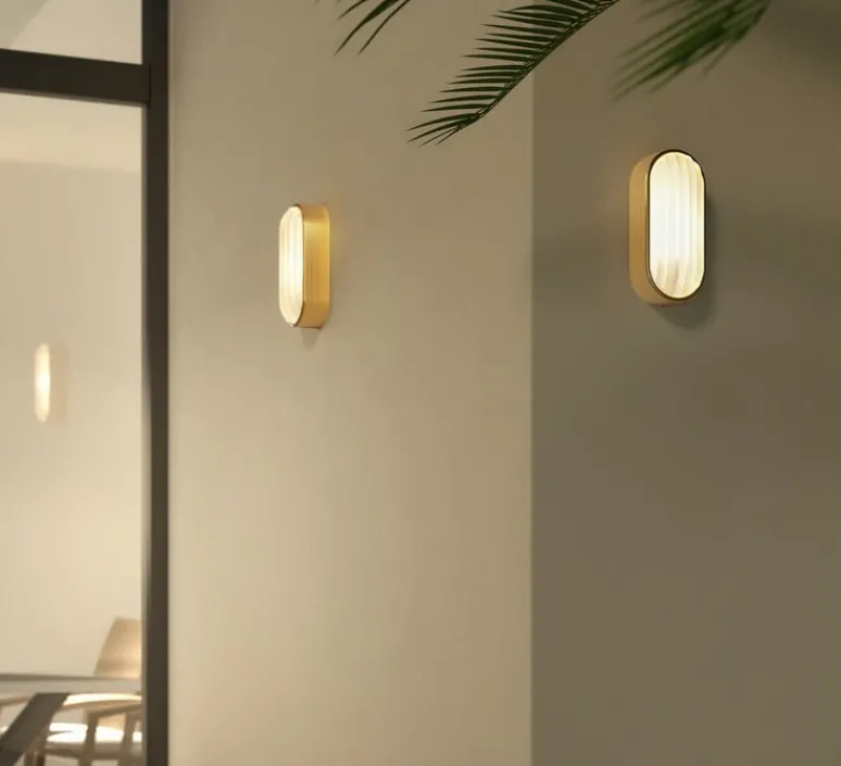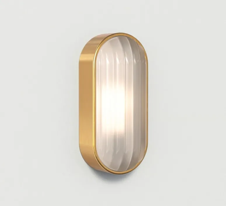 Découvrez l’applique murale d’extérieur Montreal Oval Coastal, finition laiton brossé PVD, imaginée par le studio de la maison britannique Astro.