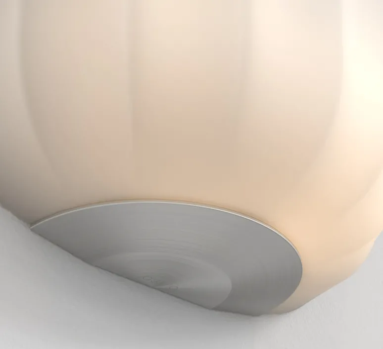 Ce luminaire s’inspire du style néoclassique avec ses finitions en verre opale et une forme rappelant un cannelé.