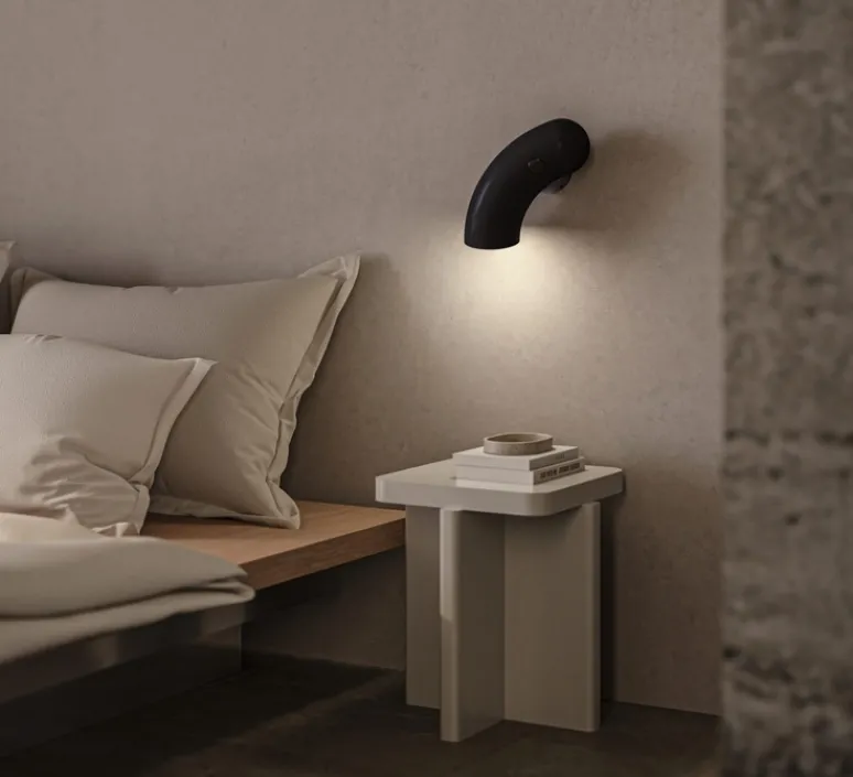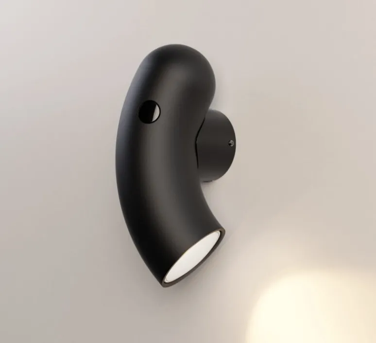 Par son revêtement noir sablé, l’applique a du caractère et dynamise son environnement. Dans un salon ou dans une chambre, Hyphen unit les opposés pour créer de l’harmonie. Sa couleur sablée fait ressortir les contours arrondis du luminaire pour lui donner une présence plus brute et naturelle. Grâce à ses versions droite et gauche, l’applique Hyphen est aussi idéale en tête de lit.