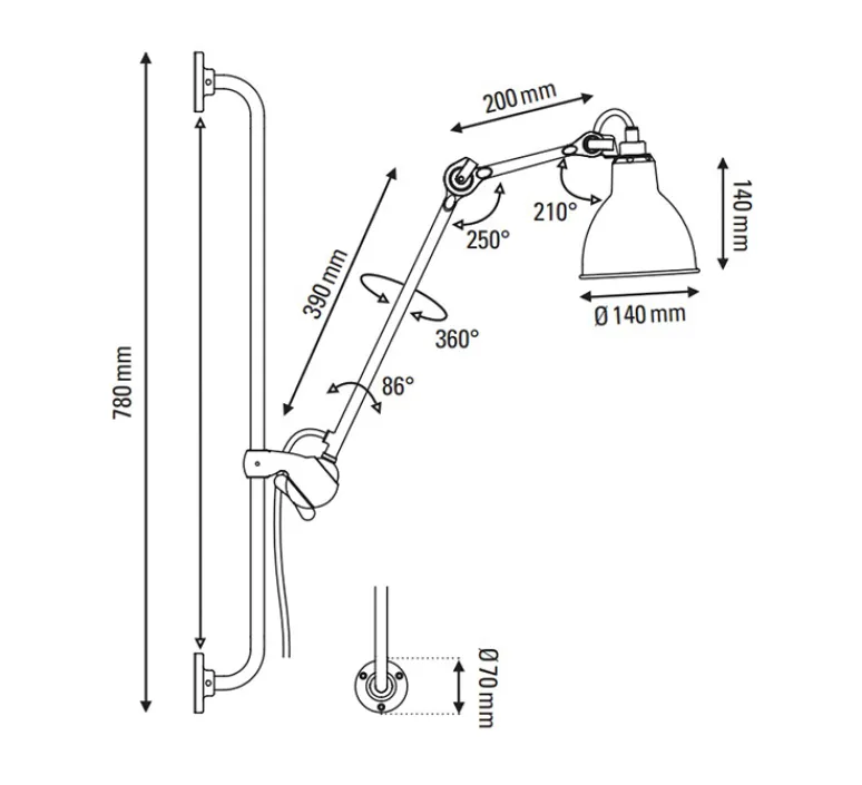 Cette applique N°210 se compose d’un bras articulé à 360° et d’un réflecteur orientable, qui permettent de diriger la lumière avec précision. Vous pouvez placer le luminaire à la hauteur de votre choix.