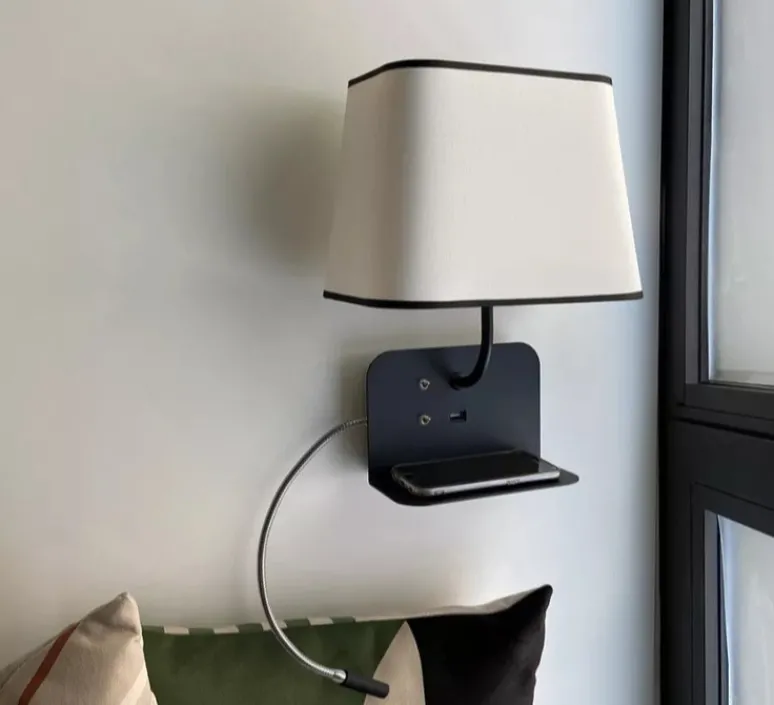 La collection Escale est particulièrement adaptée pour l’hôtellerie. En effet, dotée d’une tablette pour y glisser un livre ou son smartphone, et d’un port USB pour répondre à vos habitudes connectées. L’applique est également dotée d’une liseuse Led intégrée que vous pouvez orienter selon vos envies.