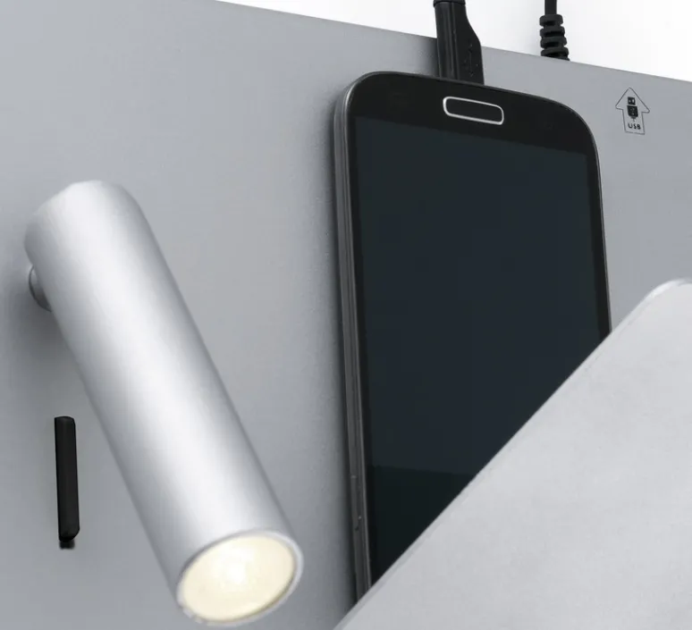 L’applique murale Suau, munie d’un port USB, design et élégante, a été imaginée par Nahtrang et éditée par le fabricant de luminaires espagnol Faro.