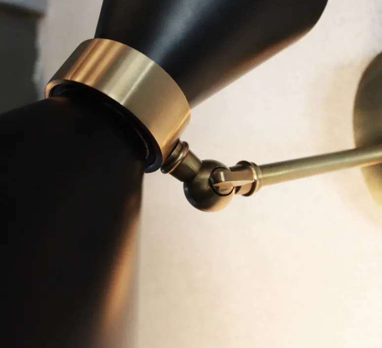 L’applique Peggy noire a une base en laiton avec une finition antique et un abat-jour mat qui s’harmonise avec la teinte dorée à l’intérieur. La cale réglable permet également de faire pivoter la lampe vers le haut et vers le bas en fonction de vos besoins, mais elle n’est pas destinée à être déplacée par la suite.