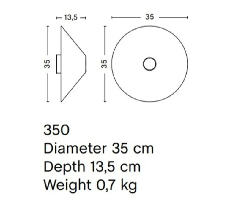 L’applique mesure 35cm de diamètre et 13,5cm de profondeur. La source lumineuse n’est pas fournie, nous recommandons une ampoule E14, 8W max.
