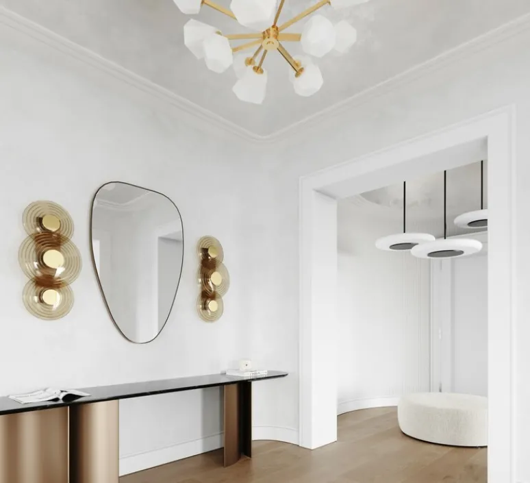 L’applique Griston, avec son design circulaire en verre fumé gris, évoque une élégance rétro. Les disques de verre à motif rayé, encadrés de laiton vieilli, imitent les ondulations des vagues pour un effet chic.