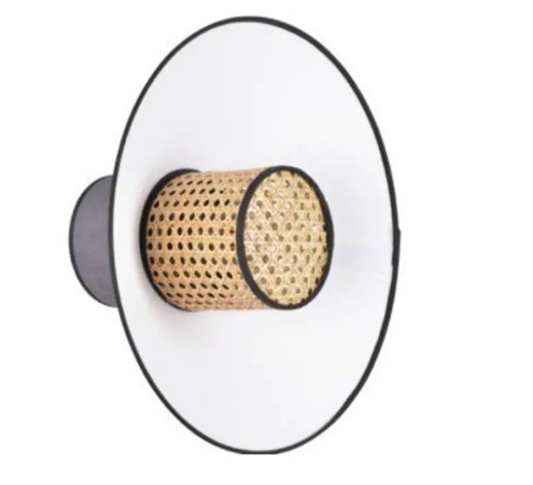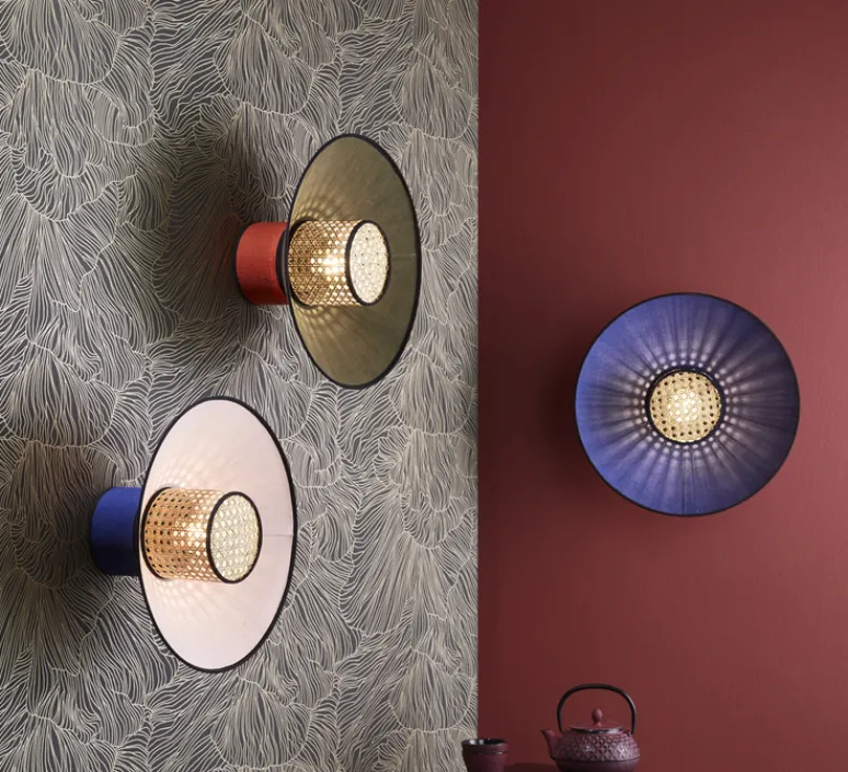 L’applique Singapour est un empilement de 3 abat-jours en lin lavé et en cannage.