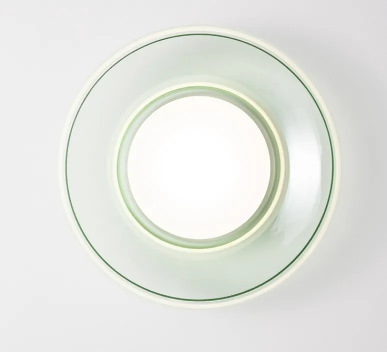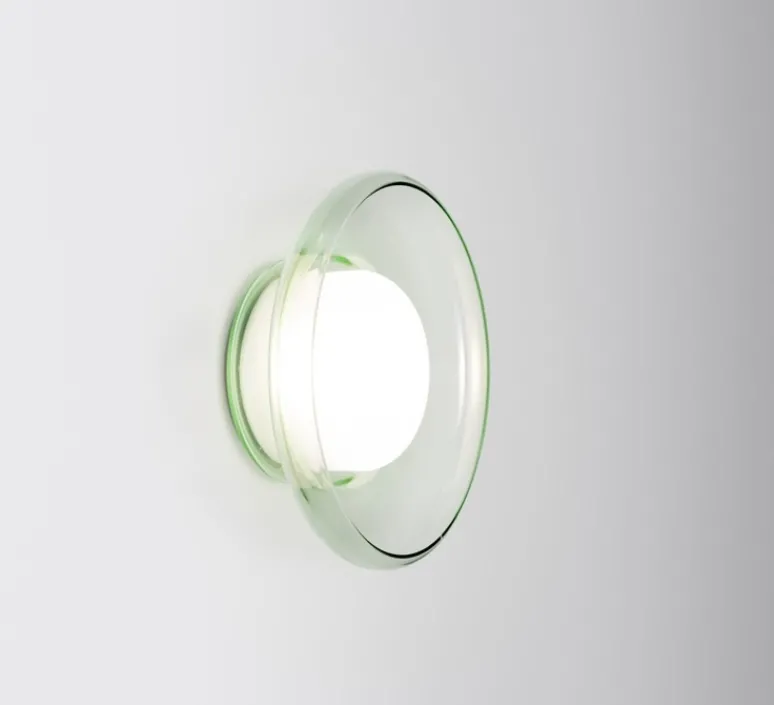 Cette version murale ou plafond est pensée pour les espaces intérieurs et repose sur une esthétique circulaire en verre finition vert d’eau, associée à une base en aluminium. Déclinée de la suspension modulable Pace, cette pièce distille la forme originelle de la série dans un volume unique, tout en conservant son langage formel rythmé.