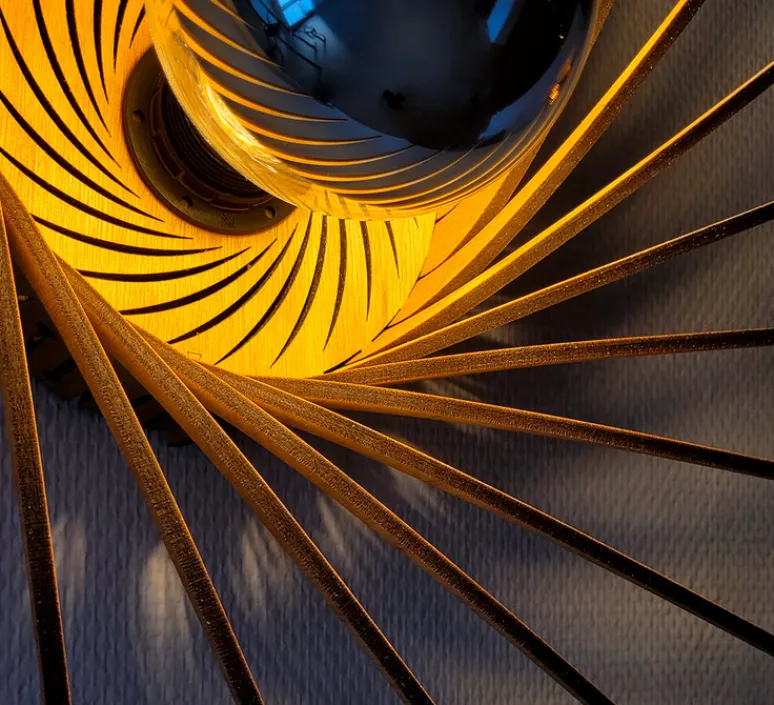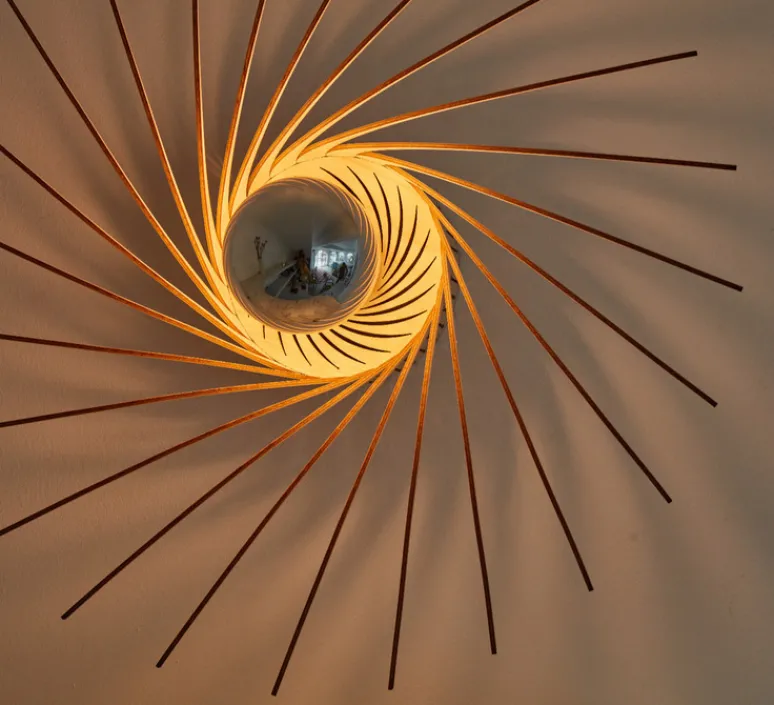 Avec son diamètre de 56 cm, Sanpedrö propose un volume subtil et graphique, dont les lignes épurées s’intègrent aisément dans un intérieur de style naturel ou provençal. Son bois de bouleau peint en noir laisse apparaître un fil continu, qui reflète la lumière de manière douce et changeante selon l’angle et l’heure de la journée.