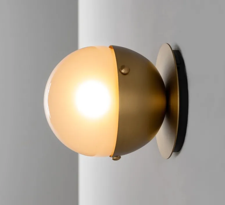 Déclinaison de l’applique Pulsar, le modèle Molécule 1 se présente sous la forme d’un globe en verre sablé placé sur une base en laiton. La base vient englober la moitié du globe et est serti de 4 petits clous. Toujours d’inspiration art déco, le luminaire prend cette fois-ci des allures plus marines et rappellent les luminaires d’un bateau.