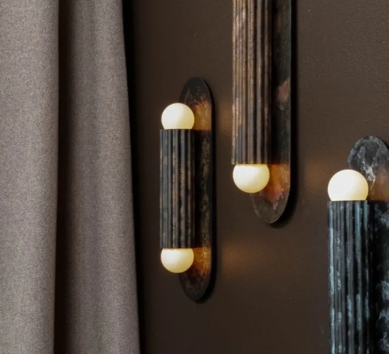 Elle se compose d’un cylindre en laiton travaillé, orné de chaque côté d’un globe en verre, reposant élégamment sur une base murale. Sa silhouette évoque à la fois la verticalité rythmée des cannelures grecques et la fluidité des drapés antiques, transformant le métal en mouvement et la lumière en poésie. Inspirée par Vesta, déesse romaine du foyer, cette applique incarne chaleur, protection et grâce intemporelle, tout en révélant le savoir-faire artisanal de Schwung à travers ses finitions patinées uniques.