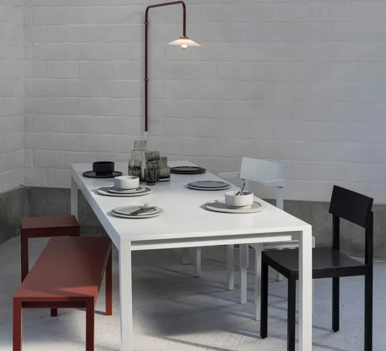 Le design de cette lampe est d’une simplicité presque naïve, et pourtant, les lignes qui la compose remplissent l’espace de manière ludique et colorée. L’applique n°5 est composée d’un tube en acier rouge courbé et d’un abat-jour blanc qui, selon Hannes Van Severen, « a une forme fantastique : parfaitement neutre ».