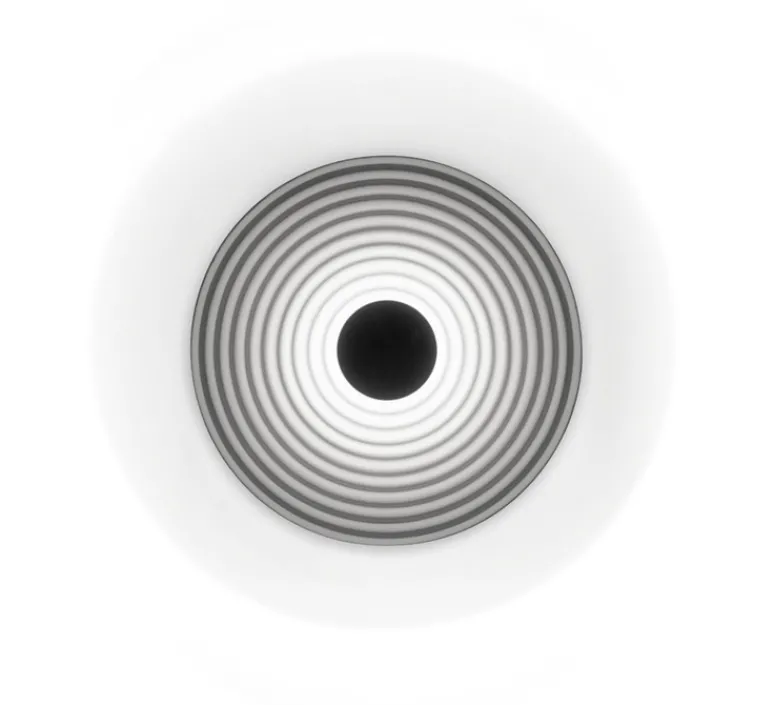 Wever&Ducré poursuit sa quête de rondeur en proposant un trio d’appliques à l’inspiration japonisante. L’applique Tapis 1.0 est composée d’un disque en plâtre strié, surmonté d’un cercle noir de diamètre plus petit, derrière lequel se dissimule la source lumineuse. Les stries sur la surface du disque permettent de donner du relief au flux lumineux. La diffusion de la lumière forme des halos consécutifs qui font penser à un Gong.