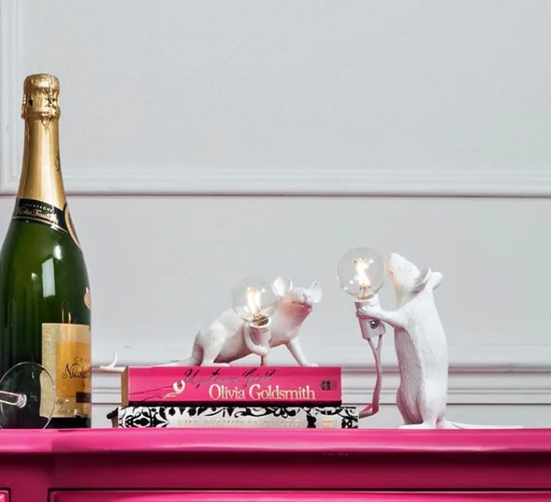 La famille des souris de Seletti est disponible en trois poses, et dans divers coloris : blanc, or ou rose.