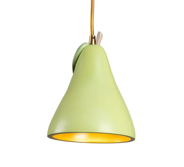 La Pear, avec sa forme évoquant une poire verte claire coupée en deux, combine un intérieur doré brillant qui réfléchit une lumière chaleureuse. Ce design chic et tendance crée une ambiance joyeuse, parfaite pour égayer une salle à manger, un salon ou une cuisine. Le câble en laiton ajoute une note élégante, rappelant l’intérieur doré de la suspension et s’harmonisant avec le style fancy et vitaminé de cette création.