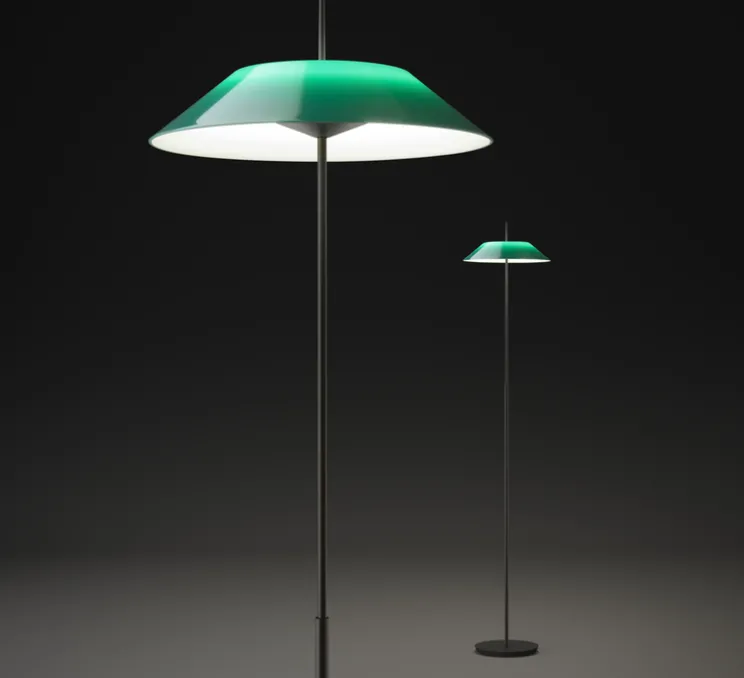 Composé d’une structure noire en acier et d’un abat-jour vert en Méthacrylate, le lampadaire offre une large diffusion de la lumière à près de 70°.