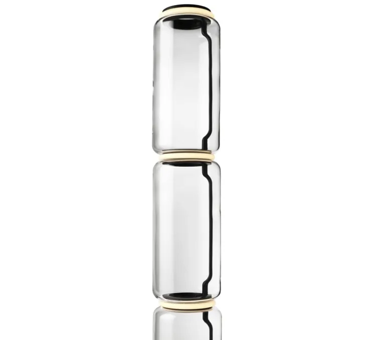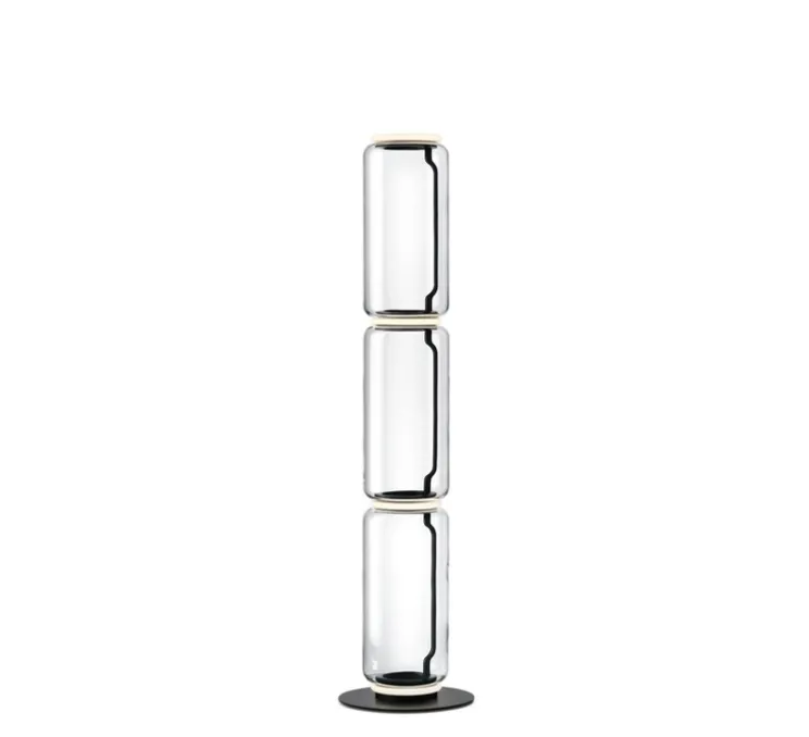 Noctambule Floor est un luminaire composé d’un à quatre éléments cylindriques, hauts ou bas, aux bords arrondis en verre, connectés entre eux pour atteindre une hauteur de 2,17 mètres dans sa plus haute version. Certaines versions ont l’option d’avoir en haut un élément conique ou demi-sphérique. Par sa flexibilité de composition, Noctambule est un lampadaire pouvant s’adapter à chaque espace, que ce soit un élément unique comme lampe à poser, ou comme totem lumineux à quatre éléments dans un salon.