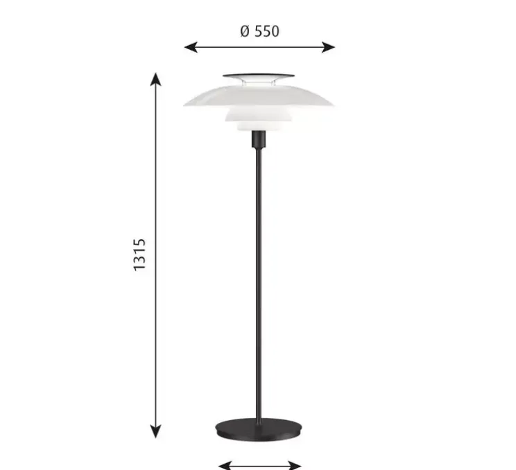 Le lampadaire PH 80 offre un éclairage diffus à 360 degrés. Il mesure Ø55 cm de diamètre et 131,5 cm de hauteur, sans fonction dimmable. Nous vous recommandons une ampoule E27 de 70W Max.