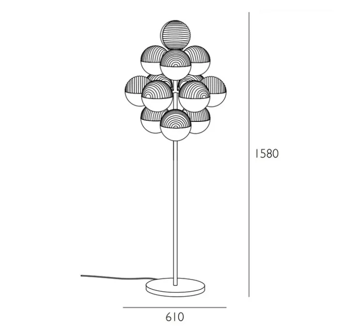 Inspiré par la forme des grappes de raisin, ce lampadaire se distingue par son assemblage de sphères en verre soufflé, créant un jeu de transparences et de reflets subtils. Son design organique et sa structure en métal élégante en font une véritable œuvre lumineuse, parfaite pour apporter une touche contemporaine et sophistiquée à tout intérieur.