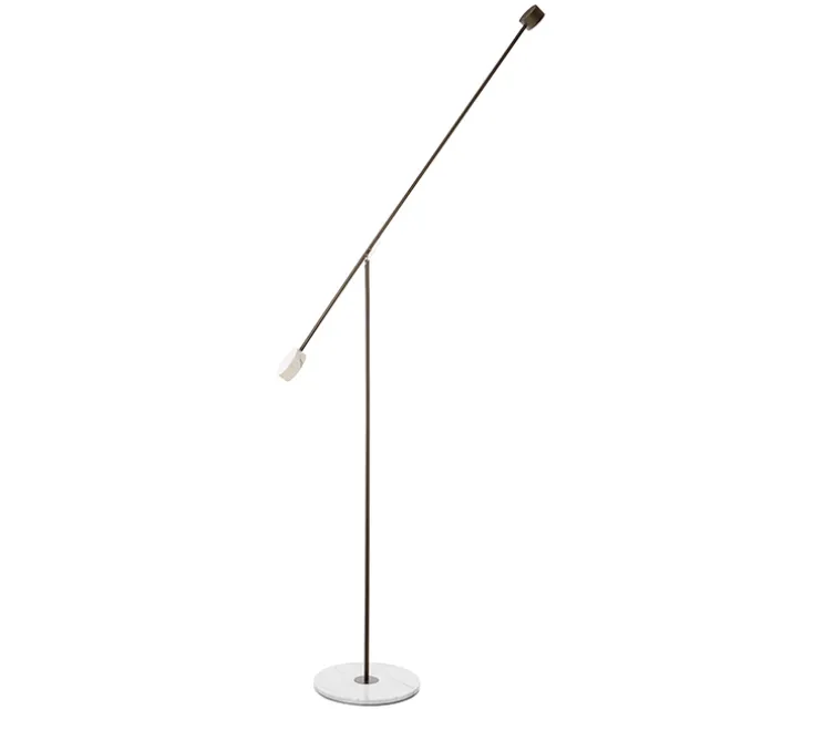 Le luminaire T-Lamp est composé d’une base circulaire en marbre, d’un long corps tubulaire en métal et d’un bras tubulaire pivotant avec d’un côté un poids en mabre circulaire et de l’autre une tête métallique circulaire intégrant la source lumineuse. S’inspirant de l’univers d’Alexander Calder, T-Lamp est gracieux et mouvementé. Le lampadaire T-Lamp se pose aisément dans une pièce de vie, un bureau ou un coin lecture.