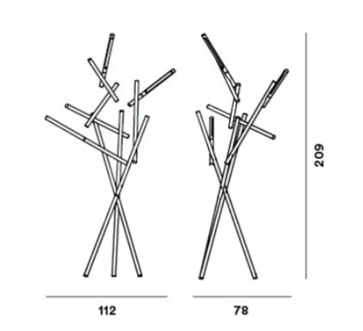 La structure principale du lampadaire se compose de 3 tiges positionnées dans des directions opposées. Sur les extrémités supérieures de chacune de ces tiges, des ramifications se superposent tel un branchage asymétrique. Cette disposition rappel les lignes d’un arbre sans feuilles qui met en valeur la sinuosité de ses branches.