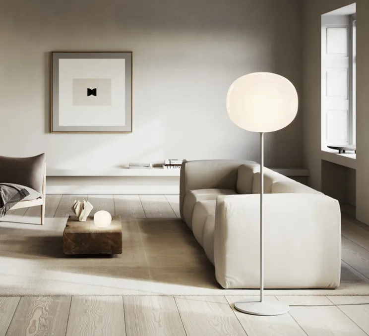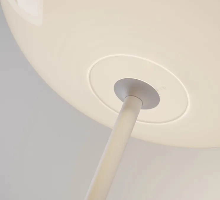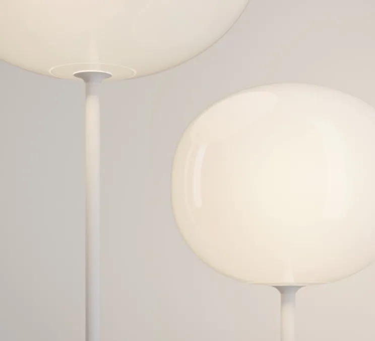 Avec sa tige métallique surmontée d’un diffuseur sphérique en verre soufflé, Volum offre une esthétique raffinée et minimaliste. Son diffuseur blanc brillant diffuse une lumière douce et homogène.
