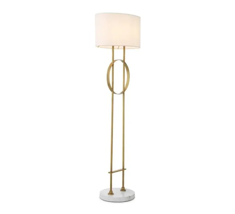 Caractérisé par un jeu de lignes géométriques, le socle en laiton antique confère à ce lampadaire contemporain une allure élégante et un air de luxe. Il repose sur un socle circulaire en marbre blanc et est fourni avec un abat-jour ovale en tissu blanc cassé. Avec une largeur de 49 cm et une hauteur de 157 cm, il possède des proportions imposantes qui en font une pièce maîtresse visuelle.