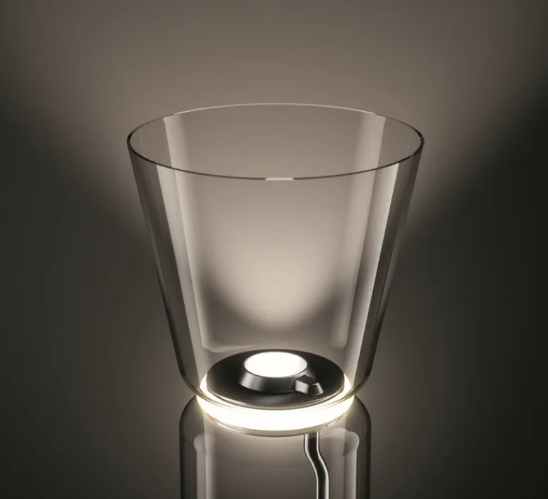 Les éléments sont en verre soufflé transparent, la base et les anneaux sont en fonte d’aluminium, les bras latéraux internes sont en acier hydro formé et les diffuseurs externes à anneau sont en silicone optique opalin moulé par injection. La longueur du câble d’alimentation est de 2 mètres, avec variateur à pédale qui permet de varier l’intensité lumineuse de 10 à 100%. Alimentation murale avec plugs interchangeables.