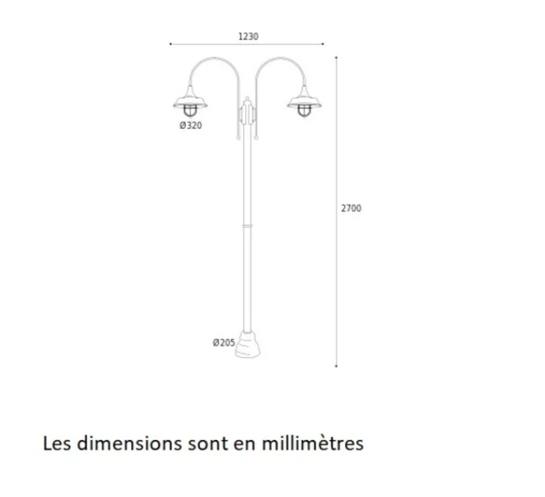 Le lampadaire mesure 2,70m de haut, 1,23m de profondeur et 32cm de diamètre. Le diamètre du pied mesure 20,5cm.
