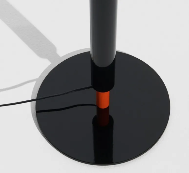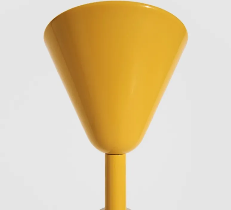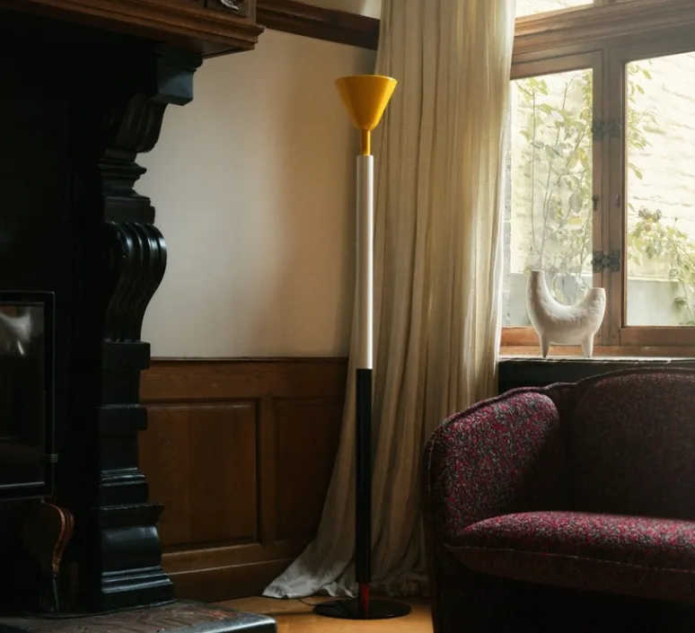 Le lampadaire PYL incarne l’esprit de la collection avec une silhouette longiligne, ponctuée d’un disque de verre moulé et pressé, signature visuelle forte. Il se compose d’une structure tubulaire et d’un réflecteur conique en acier, mis en valeur par une palette inspirée du design Memphis : jaune éclatant, rouge piment, blanc pur ou noir intense. Ce luminaire apporte une touche sculpturale à un salon, une entrée ou un bureau, tout en diffusant une lumière indirecte douce et modulable.