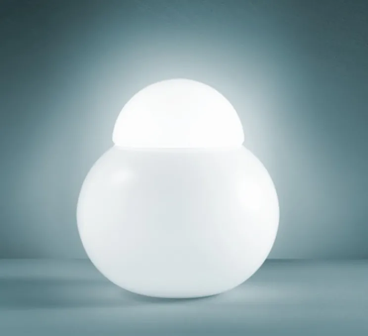 Telle une oeuvre d’art, elle a été exposée au Museum of Modern Art de New York. Une lampe à poser composée de deux éléments diffuseurs en verre soufflé blanc brillant, dont la réalisation est simple et rigoureuse avec un vase sphérique surmonté d’une petite coupe.