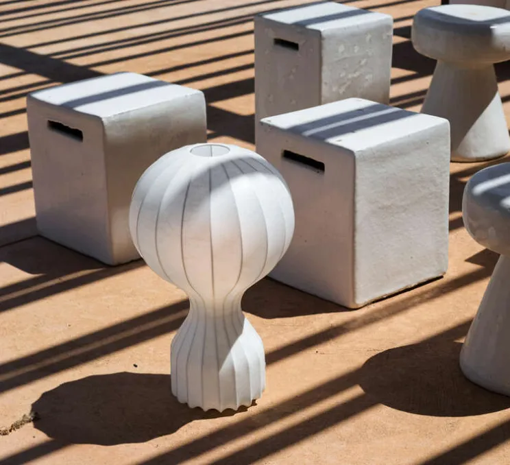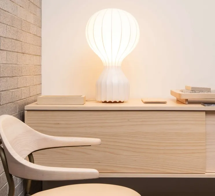 Elle se présente comme une lampe à poser dont la structure en acier courbée est recouverte d’une résine « cocoon » qui lui donne cette texture blanc fileuse. Ce matériau appliqué par pulvérisation offre à la lampe une diffusion de la lumière à 360°. Le flux diffusé est aussi plus chaleureux et non éblouissant.