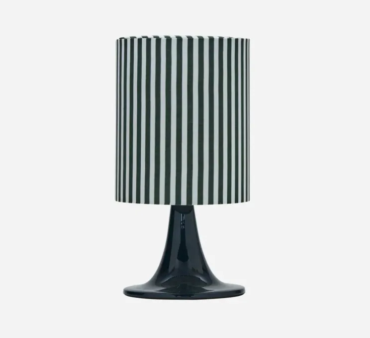 Cette lampe arbore une base verte en forme de tulipe, un clin d’œil aux styles classiques, tandis que son abat-jour blanc rehaussé de subtiles rayures blanches et vertes ajoute un caractère audacieux à votre décoration. Parfaite pour les intérieurs de style scandinave, elle trouve sa place sur une table d’appoint, un bureau ou une console, où elle ajoute une note à la fois décorative et fonctionnelle.