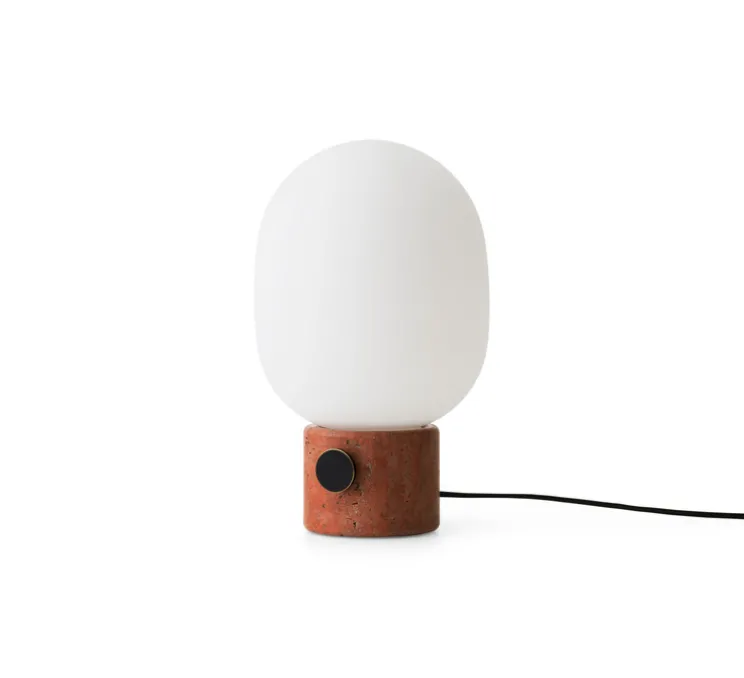Avec son socle en travertin rouge et son abat-jour en verre opale, cette lampe joue sur les contrastes entre matière brute et douceur lumineuse. Son design épuré et sa silhouette équilibrée apportent une présence graphique subtile sur une table d’appoint, une étagère ou un rebord de fenêtre. Le variateur en bronze ou laiton brossé permet d’ajuster l’intensité pour créer une atmosphère tamisée ou plus éclatante selon l’ambiance souhaitée.