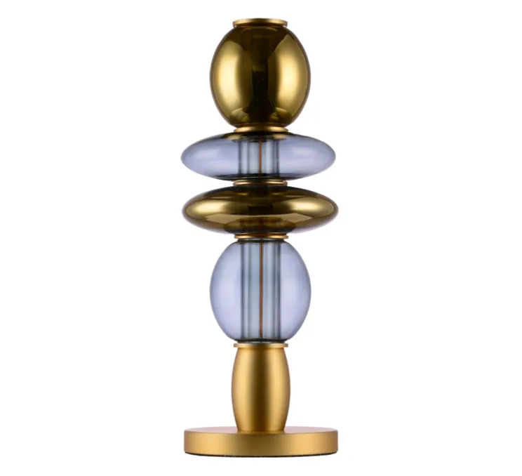 Cette lampe à poser en verre et aluminium se distingue par une variété de couleurs telles que le doré miroir et le gris fumé.