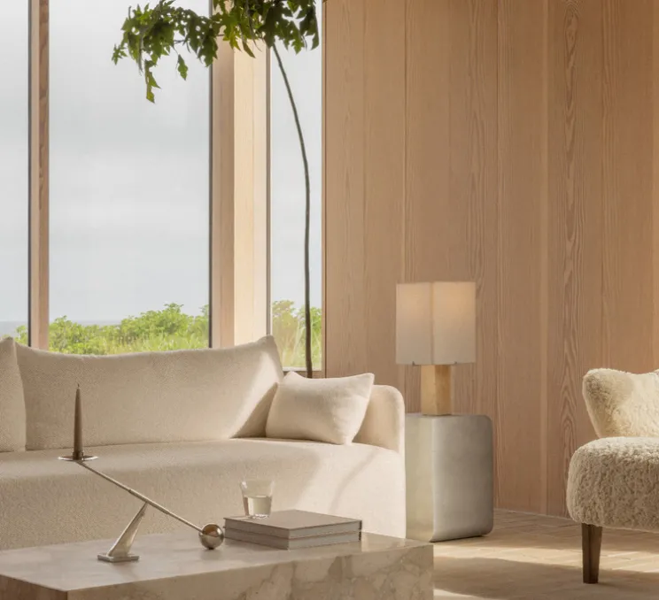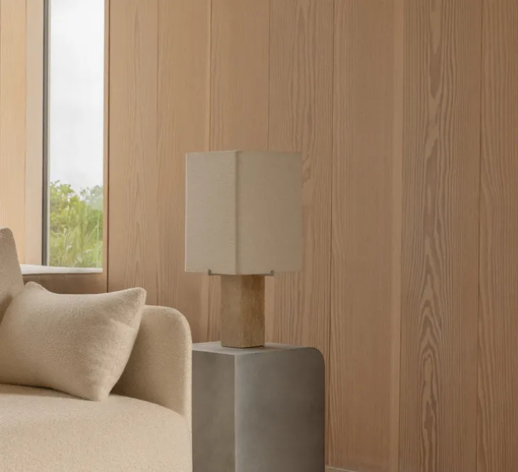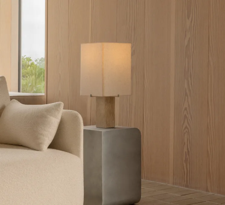 La base en travertin massif porte un abat-jour sable en tissu qui adoucit la lumière et réchauffe l’espace. Sa hauteur de 49 cm structure visuellement un meuble bas, une étagère ou un angle de pièce, tout en restant discrète. La forme cubique, les matériaux naturels et les tons neutres permettent une intégration fluide dans une décoration de style Japandi.