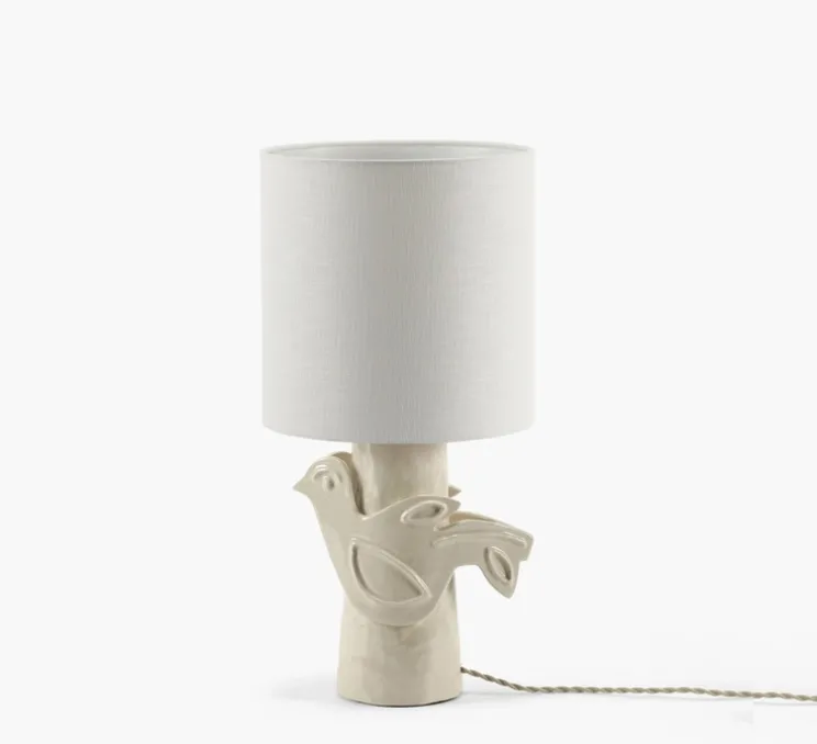 Inspirée par les œuvres emblématiques de l’artiste, cette lampe se compose d’une base en grès ornée d’une colombe et d’un abat-jour en lin. La colombe modelée rappelle les esquisses de Picasso en hommage à sa fille Paloma. Cet élément offre à la lampe un caractère distinctif et lui confère un charme subtil et doux.