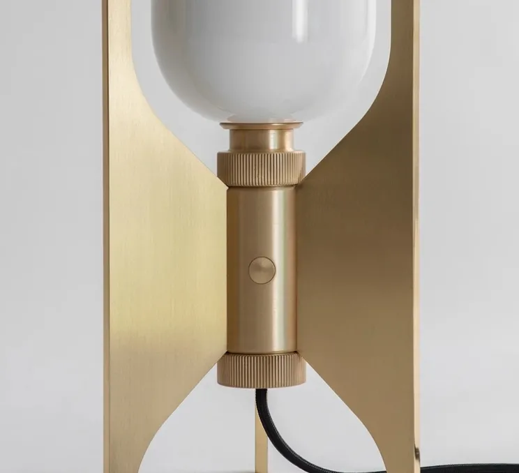L’abat-jour est réalisé en porcelaine de chine. La base est en laiton brossé.