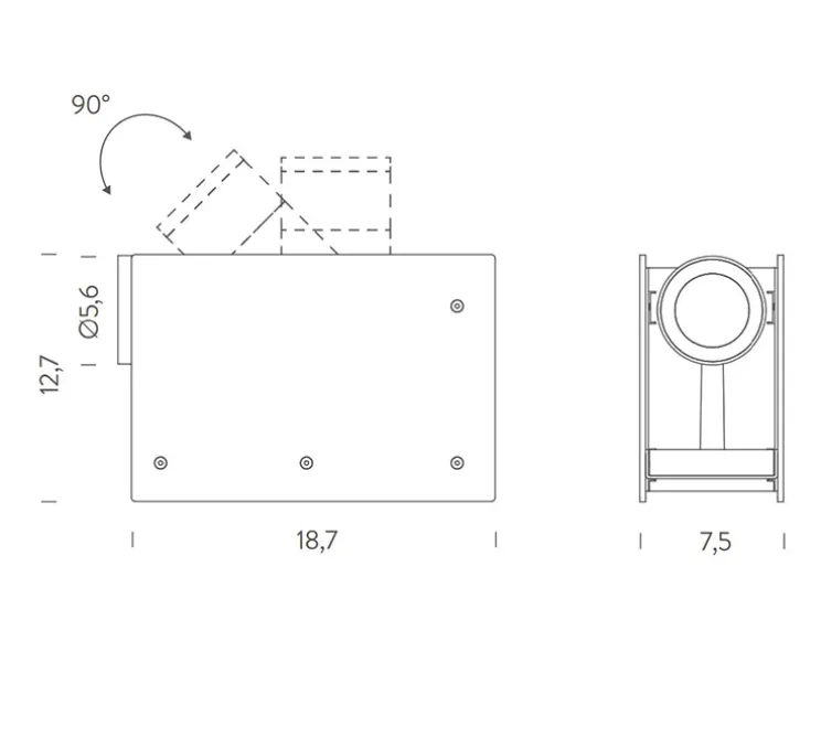 Le luminaire Plint est composé d’un corps cuboïde embrassant un spot tubulaire pivotant.