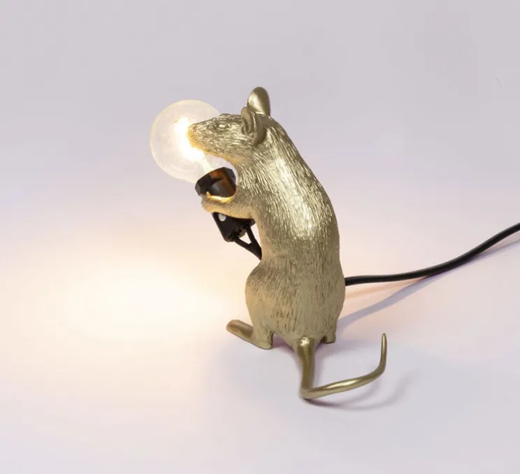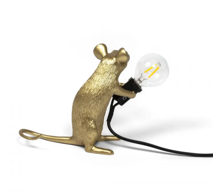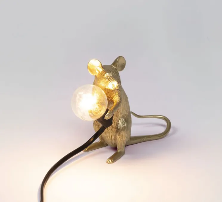 Mouse Lamp Mac Sitting est une lampe à la forme d’une souris au pelage doré, assisse sur ses pattes arrière, tenant entre ses pattes avant une ampoule et son câble noir. Telle une étrange sculpture lumineuse, Mouse Lamp Mac Sitting se fait remarquée dans chaque intérieur, qu’elle soit posée sur une table de nuit ou cachée entre deux livres sur une étagère.