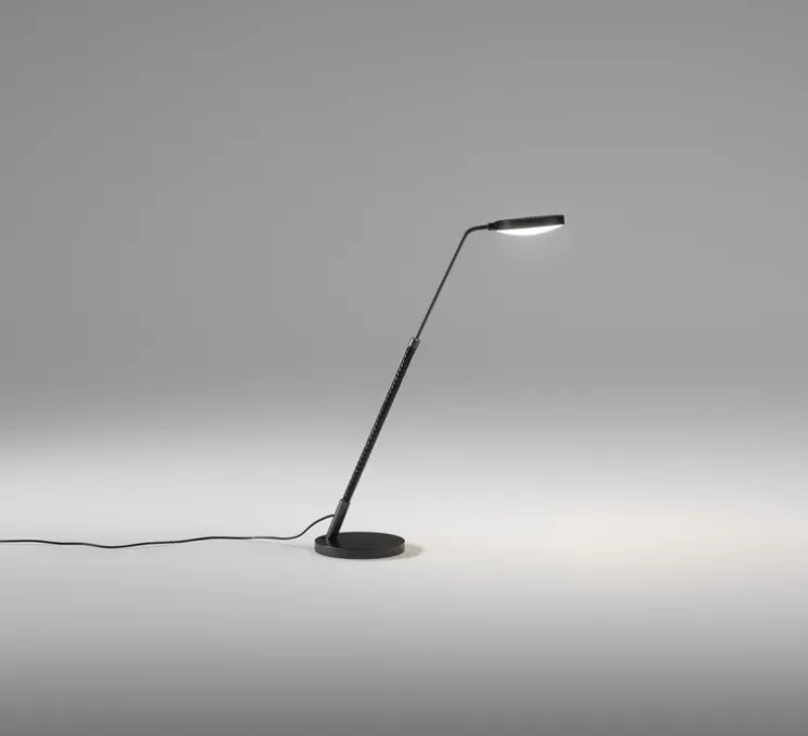 La lampe à poser Spoon mesure 11cm de diamètre et 63cm de hauteur. Le module Led intégré d’une puissance maximale de 4W diffuse 600 lumens avec une colorimétrie de 3000K offrant un éclairage puissant et confortable. Le variateur se trouve sur le câble noir d’1m80. Orientation verticale : 45°.