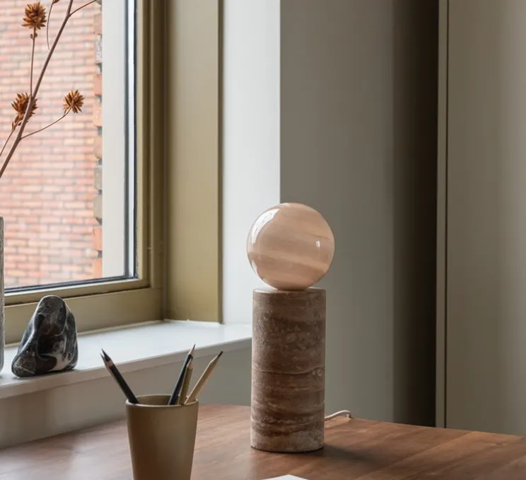 La lampe à poser Tivoli d’It’s about Romi, associe marbre et verre dans une forme cylindrique qui traduit l’esprit minéral de la marque.