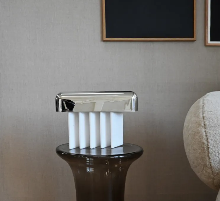 Son abat-jour en métal chromé, légèrement incurvé, repose sur cinq pieds sculptés en marbre cristallisé, laissant filtrer une lumière douce et chaleureuse. Idéale pour créer une atmosphère tamisée, la Beetle trouve sa place aussi bien sur une étagère que sur une table de chevet ou un rebord de fenêtre. Sa silhouette minimaliste et sculpturale s’intègre parfaitement dans un intérieur contemporain, ajoutant une touche d’élégance intemporelle.