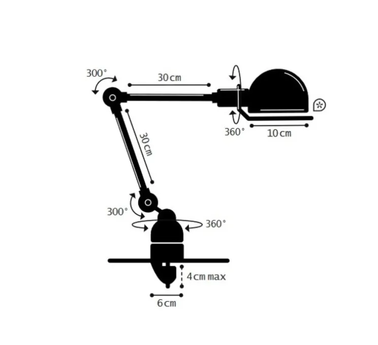 La lampe Signal 2 bras (30 et 30cm) offre une grande adaptabilité. Très maniable et orientable grâce à ses trois articulations, elle est également très robuste de par son armature en acier et fonte d’aluminium.